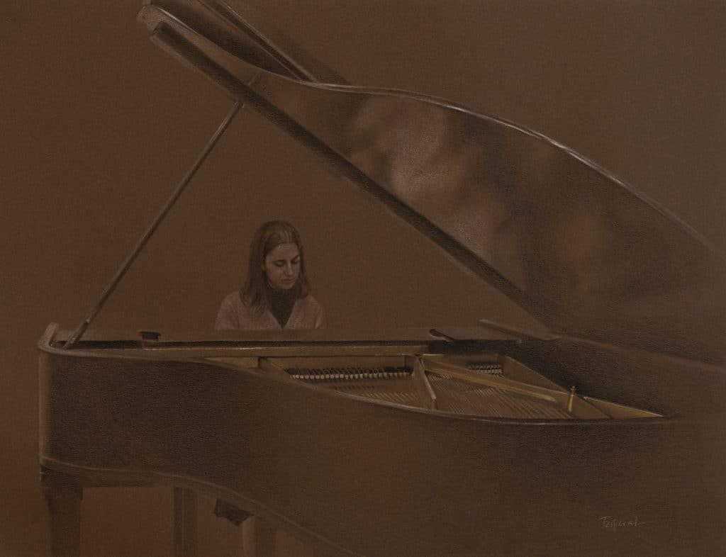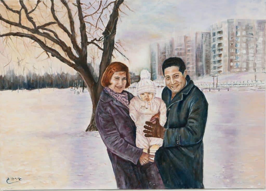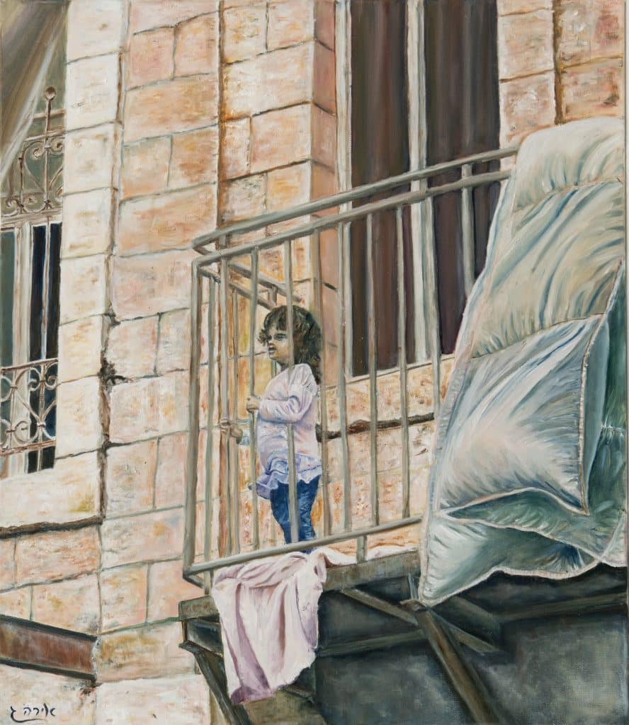 הציור מתאר ילדה קטנה העומדת לבדה על מרפסת ברזל ירושלמית, אוחזת בסורג ומתבוננת החוצה, חולמת, צופה…. המרפסת הופכת לסמל למרחב בין פנים לחוץ. כילדה, גם אני אהבתי לעמוד במרפסת הבית שלי, להתבונן, לצפות ,לשקוע במחשבות , שמיכת הפוך שמונחת לאוורור על המרפסת לצידה, מוסיפה נגיעה של חום ורוך – רגע ביתי שמכיל בתוכו כמיהה שקטה […]