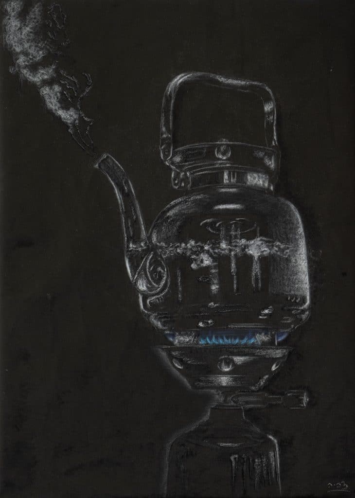 על בד קטיפה שחור, מצוייר קומקום שקוף. הדימוי מתאר נשיאת הפכים. כלי הזכוכית מייצג את הנפש השברירית, שיכולה לשאת בתוכה מכלול רגשות מנוגדים. הבחירה לצייר דווקא בצבע לבן, מבטאת את הבחירה לראות גם בתוך מציאות מורכבת ומאתגרת – דווקא את האור. מסבירה האמנית צביה סימן טוב: "לפעמים אני מרגישה כמו קומקום שבפנים הכל גועש, רועש, […]